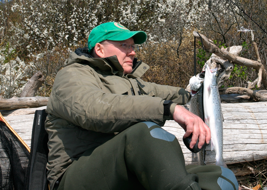 Det var svære betingelser med uklart vand, men jeg havde på fornemmelsen at fiskene var tilstede. Nedenstående ørred var i hugget og knaldede hårdt til efter ganske få omdrejninger på hjulet. En god oplevelse med en stærk fisk, som gav sig 100 procent. Forløbet på fighten blev klassisk med billeder, som brænder sig fast på nethinden med en springende ørred i horisonten. Når det går godt er det fedt, men super ubehageligt under fighten. Selv inde ved stangspidsen sprang den rundt og det gik galt med fri fisk i overfladen. Med min smidige krop sprang jeg frem og fik skudt nettet ind under fisken. Derfor kan jeg oplyse at vægten på ørreden var 3.75 kg. Almost catch and release 2016.