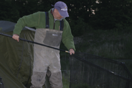 Det sidste spørgsmål i mine tanker var, om jeg skulle skifte agn-pladser? Svaret blev nej, nu havde jeg brugt så meget tid på søen med to besøg plus 12 timers nulbon, nu kørte jeg systemet helt igennem. Mine boilies blev lagt ud meget koncentreret. Jeg sad tilbage med min cowboy kaffe og nød den første morgensol. Nogle små lyde fra min optonic fik mig til at smide kaffen og springe frem til rod pod’en, men jeg var ikke i stand til at se om det var et drop back. Mit modhug blev desværre ikke tungt. Efter så mange timers nulbon gav den lille episode lidt hjertebanken. Ud med tacklet igen. Jeg gik om bord i endnu et krus kaffe. Efter cirka 30 minutter begyndte cowboy kaffen at sætte sine spor i min krop og jeg måtte træde af på naturens vegne. Efter endt toilette i busken og ikke i buksen var jeg på vej tilbage til "campen" da jeg hørte min optonic biiiiiiiiip og jo tættere jeg kom rod pod'en kunne jeg se og høre, hvor meget min spole fik bank. Op med stangen, ikke noget modhug, den karpe var kroget. Et hurtigt blik udover vandet, ja den var i sivene dog i et område, hvor sivene ikke stod så koncentreret. Et rimeligt pres blev lagt på karpen og jeg fik den vendt. Nu kørte den parallelt med sivene. Endnu et pres fik den flere meter væk, herligt! Endnu et koncentreret blik på line og fisk vidnede om, at der sad noget puha et sted på hovedlinen. Linen gik ikke direkte ned i tacklet. Jeg vinklede fighten, gik mod højre og i samme moment fik jeg fat i ketsjeren. Efter nogle tunge udløb var hovedlinen blevet frigjort fra sit puha og karpen var på vej over i det område, hvor jeg ville styre showet. Karpen fik lov til at gå stille og roligt og arbejde med bremsen og aktionen i stangen. På et tidspunkt var den lige oppe og vende - det var et traktordæk. Det jeg var i gang med var stort, denne fisk skulle helt ind. Fisken var ikke vild, men meget tung. No mercy, den tog flere af de klassiske udløb, kun et hvor jeg blev lidt betænklig. Den første krise gik godt og nu var det bare om at handle, så jeg begyndte at gå ud i vandet. Et rimeligt pres fik karpen tæt på ketsjeren, første forsøg gik ikke, men i det andet var der jackpot. Et kig ned i rammen og jeg var overhovedet ikke i tvivl om, at en ny personlig var på skemaet. Det var den fedeste karpe jeg nogensinde havde set "live". Ind med gearet og gøre klar til vejning, frem med vægten. De første streger forsvandt i et hurtigt tempo. Ding dong 15,3 - knald fede kilo Det var lidt svært, at stå med sådan en spændende fisk helt alene. Jeg tænkte om jeg skulle sacke dyret og pakke sammen og køre hjem efter "hjælp". Det endte med, at jeg tog en del billeder med selvudløseren. Karpen fik hurtig sin frihed. Det var fedt at genudsætte dyret og mærke hvor mange kræfter den stadigvæk havde i behold efter en god fight. Efter fotografering og genudsætning gik jeg op til "campen" og tog det sidste kaffe, fik gang i mine stænger og fortsatte fiskeriet dog i en total afslappet atmosfære. Efter 24 timers fiskeri og 1 fisk på land måtte jeg se i øjnene, at fiskeriet havde været "skide" godt.